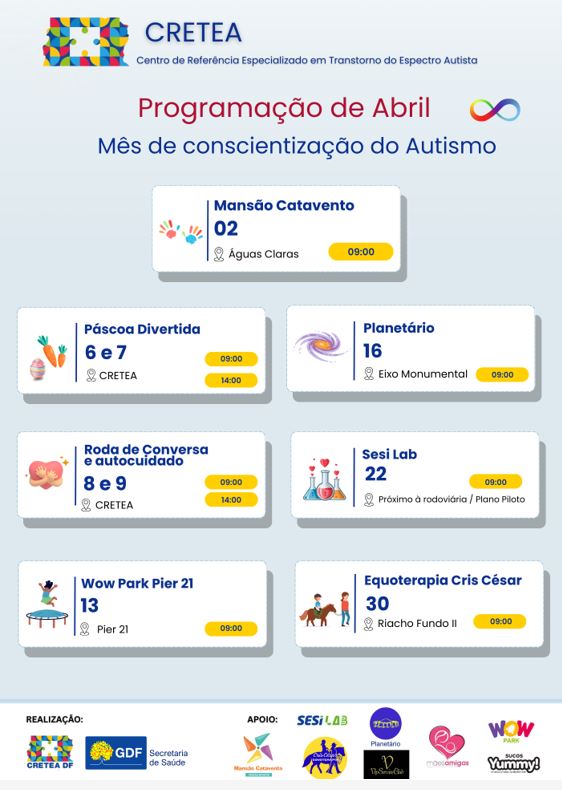 Entre outras ações previstas, estão as visitas ao Planetário de Brasília, no dia 16 de abril, e um evento de equoterapia recreativa, no dia 30. A programação completa pode ser conferida no banner abaixo: