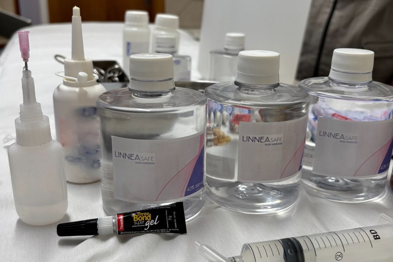No local, as equipes encontraram produtos sem qualquer identificação, incluindo um galão grande contendo líquido semelhante a silicone. Foram identificados também produtos falsificados para preenchimento cutâneo, como frascos de 300 ml rotulados com os dizeres “LINNEA SAFE Body Hidrogel, com registro Anvisa n. 80256510006, lote 2007H – Validade: 12/2022”.