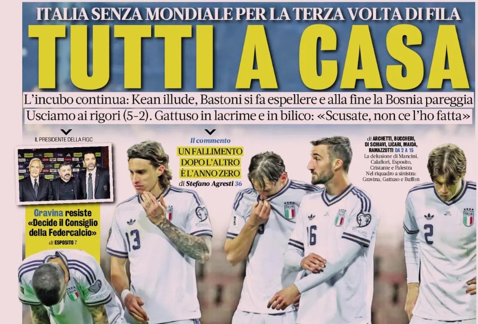 Kean engana, mas o cartão vermelho de Bastoni aos 42 minutos deixa os azzurri reduzidos a dez jogadores, mas na segunda parte perderam três oportunidades incríveis. Depois o 1-1 (ilegal) de Tabakovic e as lutas até ao final do prolongamento. Os erros de Esposito e Cristante na cobrança de pênaltis são decisivos. O fracasso em Zenica é o espelho do nosso futebol: deve ser reconstruído, a partir dos dirigentes federais. Nem os árbitros nos respeitam mais: Turpin perdoa Muharemovic (merecia o cartão vermelho), que depois bloqueia com o braço um remate de Pio. Gattuso em lágrimas: 'Peço desculpas à Itália, não consegui.'