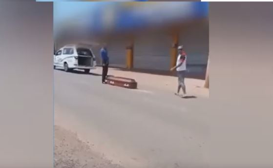 O registro mostra um funcionário da funerária solicitando ajuda a um homem para recolocar o caixão de volta no veículo.