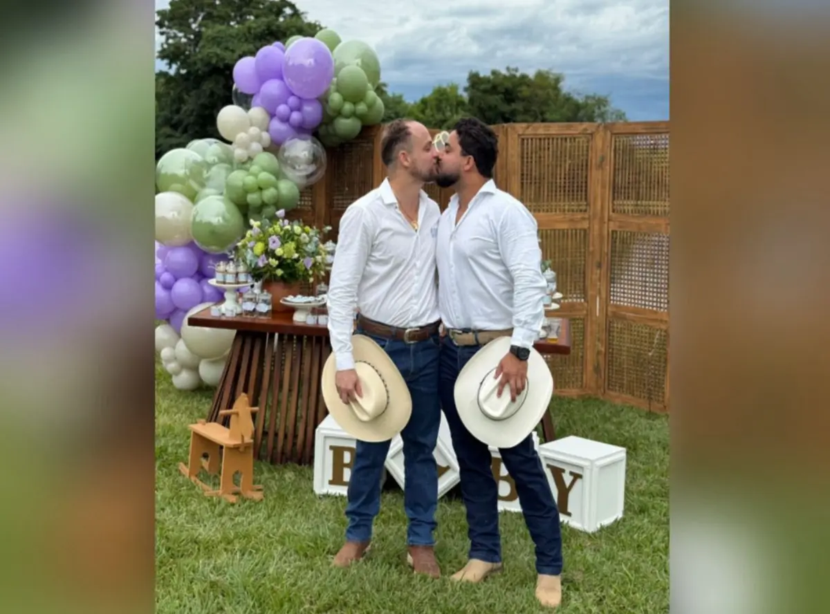 O casal Sillas Matias Silveira, de 32 anos, e Layron Simplício, de 28, realizou um chá revelação para anunciar aos familiares o sexo do primeiro filho. O evento foi realizado no último sábado (17), em Goiatuba, no interior de Goiás, e marcou mais um capítulo da trajetória dos dois rumo à paternidade. Juntos desde 2018, o assessor de juiz e o médico decidiram realizar o sonho de ter um filho por meio da fertilização in vitro (FIV). A gestação ocorre por meio de barriga solidária, conduzida por uma amiga próxima do casal que se voluntariou para gerar o bebê. Atualmente, a gravidez está no terceiro mês.