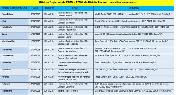 As informações das oficinas regionais das demais regiões administrativas serão publicadas posteriormente pela Secretaria de Transporte e Mobilidade (Semob-DF). As sessões serão programadas em semanas não consecutivas. Os grupos de todas as regiões administrativas vão se reunir em endereços distintos, a serem divulgados com antecedência pela Semob-DF.