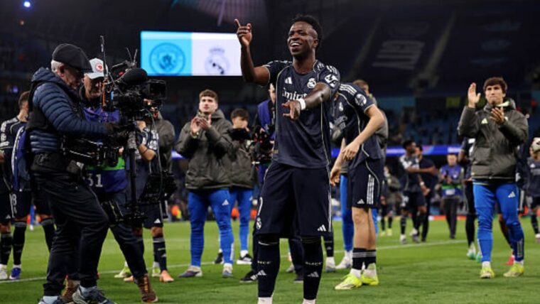 Vinicius selou a vitória do Real Madrid nos acréscimos, ao acertar um chute preciso de Tchouameni sobre Donnarumma.
