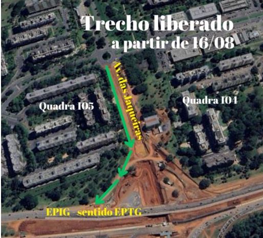 Com o avanço das obras do viaduto da Estrada Parque Indústrias Gráficas (Epig), em fase final, o Governo do Distrito Federal (GDF) libera, a partir das 10h desta quarta-feira (16), trecho de 370 metros, próximo à quadra 105 do Sudoeste, referente ao balão da Avenida das Jaqueiras/Primeira Avenida até a Epig, sentido Estrada Parque Taguatinga (EPTG).