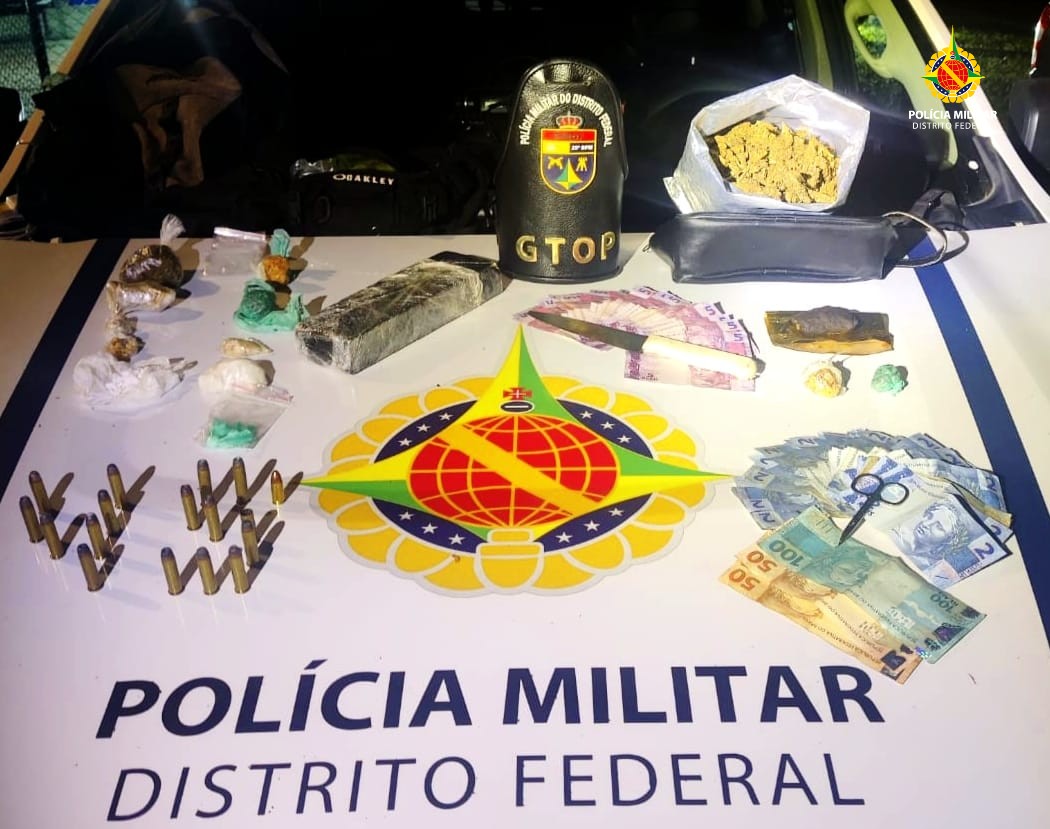 Dentro da residência, os policiais localizaram 16 munições de calibre .357, incluindo uma já deflagrada, além de uma munição de 9mm. Além disso, a varredura identificou porções de cocaína, crack e haxixe, tabletes de maconha e uma sacola com maconha orgânica. A equipe também recolheu faca, dinheiro em espécie e itens usados para separar e embalar drogas.