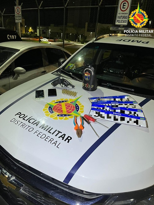Dois pares de placas automotivas também foram apreendidos. Um dos pares tinha registro de furto, e o outro apresentava indícios de fabricação clandestina. Ferramentas como chave de fenda, chave Phillips e alicate foram recolhidas.
