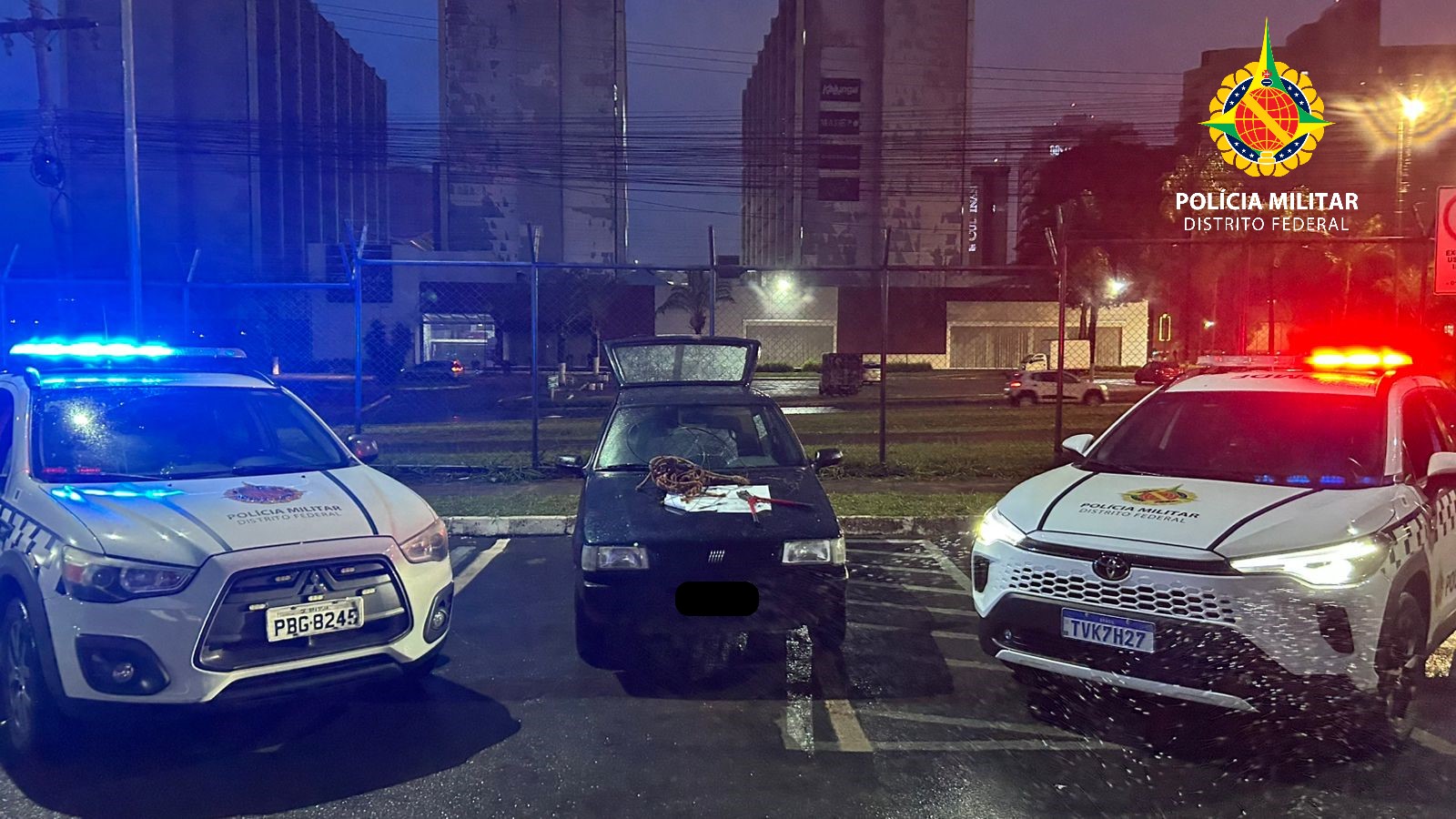 Durante a varredura no local, as equipes localizaram uma chave-micha e um alicate de grande porte, instrumentos normalmente utilizados em crimes contra o patrimônio. Em diligências complementares, já na Quadra 300B, foi encontrado um veículo Fiat Uno, de cor verde, com sinais de arrombamento na porta e na ignição.
