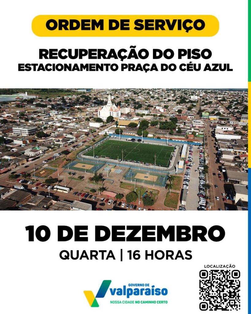 O prefeito de Valparaíso, Marcus Vinicius assinará nesta quarta-feira, às 16 horas, a ordem de serviço para a recuperação do piso do estacionamento da Praça do Céu Azul. A obra visa melhorar as condições de acesso e segurança para os frequentadores do espaço, que é um dos principais pontos de convivência do bairro.