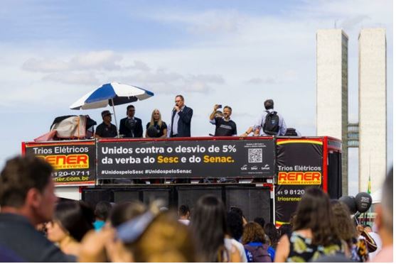 Um protesto pacífico ocorrido nesta terça-feira (9), em frente ao Congresso Nacional, em Brasília, intensificou o movimento de apoio ao Sesc e ao Senac. Os manifestantes se reuniram para demonstrar sua indignação com o projeto de lei de Conversão (PLV) nº 09/2023, que está em tramitação na casa e desviará 5% das contribuições sociais destinadas pelas empresas do setor terciário ao Sesc e ao Senac para a Embratur.