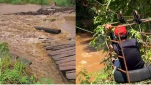Para chegar à cidade vizinha que fica cerca 30 km, Moradores se arriscam com tirolesa para cruzar rio. Moradores do distrito de Lagolândia, na cidade de Pirenópolis, optaram por se arriscar em uma tirolesa improvisada após a ponte que os conectava ao município de Vila Propício ser arrastada pela chuva.