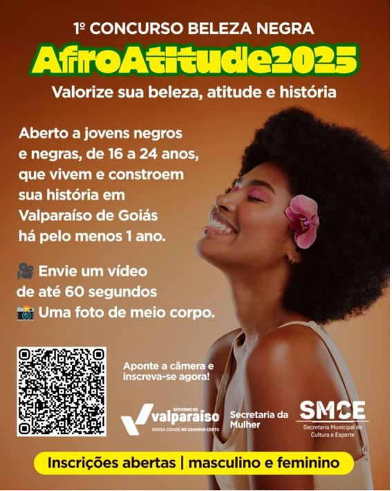 A Prefeitura de Valparaíso de Goiás, por meio da Secretaria da Mulher e da Secretaria Municipal de Cultura e Esporte, abre as inscrições para o 1º Concurso Beleza Negra AfroAtitude 2025, uma iniciativa inédita que tem como objetivo valorizar e promover a representatividade negra, enaltecendo a beleza, a atitude, a história e a identidade de jovens negros e negras do município.