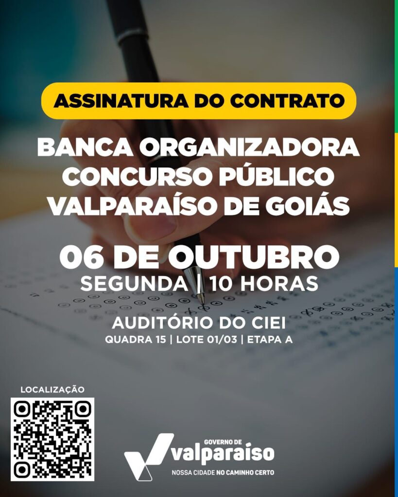 Mais um passo importante para o Concurso Público de Valparaíso de Goiás será dado na próxima segunda-feira, 06 de outubro, às 10h. Na ocasião, acontecerá a assinatura oficial do contrato com a banca organizadora, em cerimônia marcada para o Auditório do CIEI. O ato representa um marco significativo no andamento do certame, consolidando o compromisso da gestão municipal em oferecer novas oportunidades para a população.