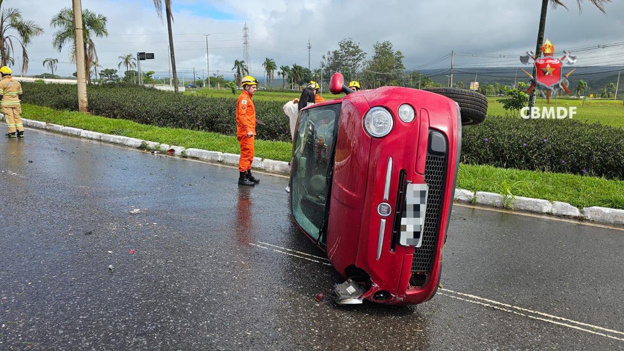 Ao chegarem ao local, as equipes encontraram um veículo Fiat 500, de cor vermelha, tombado na via. A condutora foi avaliada pelos bombeiros, estava consciente e orientada e não apresentava ferimentos, não sendo necessário o encaminhamento a uma unidade hospitalar.